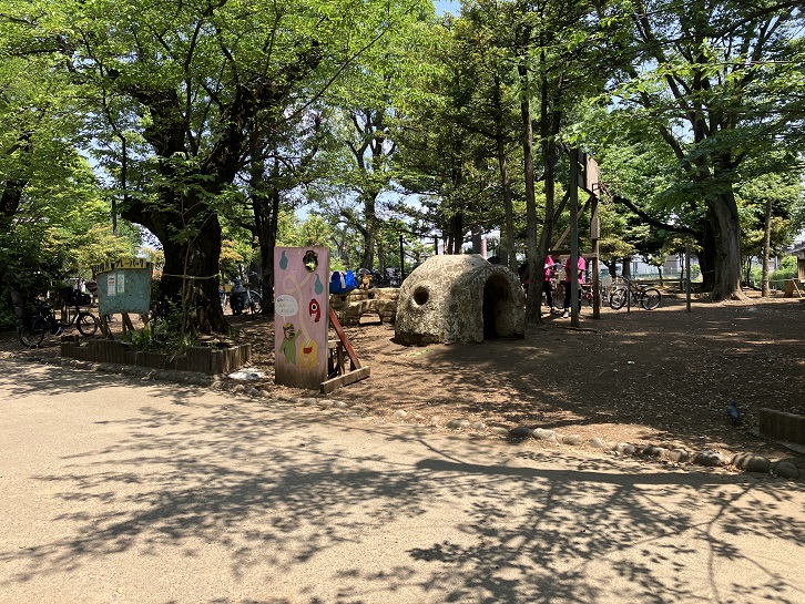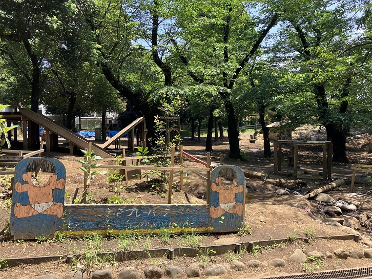 公園の南東側には、子供達が泥遊びや水遊びを思いっきり出来るプレーパークが設けられています。プレーパークは、世田谷区と地域住民が作った子供達が自由に遊ぶことを目的とした空間です。プレーパークには、子供達と一緒に遊んだり、遊具を作ったりしてくれる「プレーワーカー」が常駐しています。プレーワーカーは、遊びの楽しさを教えてくれたり、相談に乗ってくれたり、子供達を見守り寄り添ってくれる存在です。遊具は、他の公園では見られないような手作りのものばかりです。木にロープをくくりつけただけのブランコや、木でできた滑り台(夏にはこれにブルーシートを張ってウォータースライダーに変身します)など、一見危なさそうに見える遊具も子供達自身が自分の体の使い方や力量を知りながら遊ぶことができるので、バランス感覚や運動能力を育てるのに役立ちます。