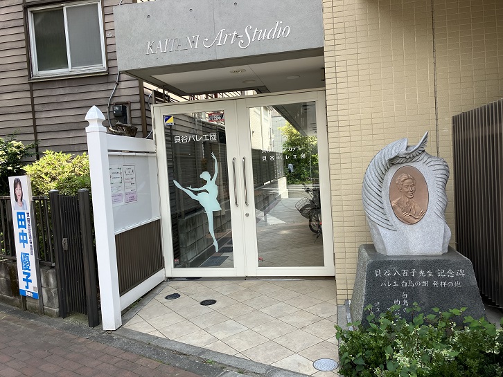 北の広場の東松原駅口から南西方向に進みます。とある建物のドアガラスに「貝谷バレー団」と書かれています。貝谷八百子は、大正十年(1921年)に福岡県大牟田市で生まれました。生家は鉱山主で、豊かな家庭だったといわれています。昭和八年(1933年)に文化学院に入学するために上京し、翌年からエリアナ・パブロワにバレエを学びました。昭和十三年(1938年)に貝谷バレエ団を立ち上げ、歌舞伎座を借り切ってデビュー公演を行いました。昭和二十一年(1946年)に蘆原英了・小牧正英などと共に東京バレエ団を結成し、同年8月9日に帝国劇場で第1回公演「白鳥の湖」全幕を日本で初めて演じ、貝谷は主役(オデット)を務めました。昭和二十五年(1950年)に東京バレエ団が解散した後もバレエ界で活躍を続け、昭和四十年(1965年)に貝谷芸術学院を設立し、後進の育成や指導に当たりました。平成二年(1990年)に逝去しましたが、没後の平成十九年(2007年)に「バレエ白鳥の湖発祥の地」の記念碑が貝谷バレエ団の敷地内に建立され、同年8月9日に除幕式が行われました。