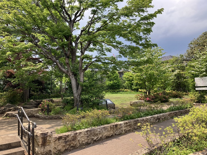 この庭園は、最高裁判所赤堤公邸跡に造られたとのことです。当時の写真を添えた案内のプレートが石の上に留められています。