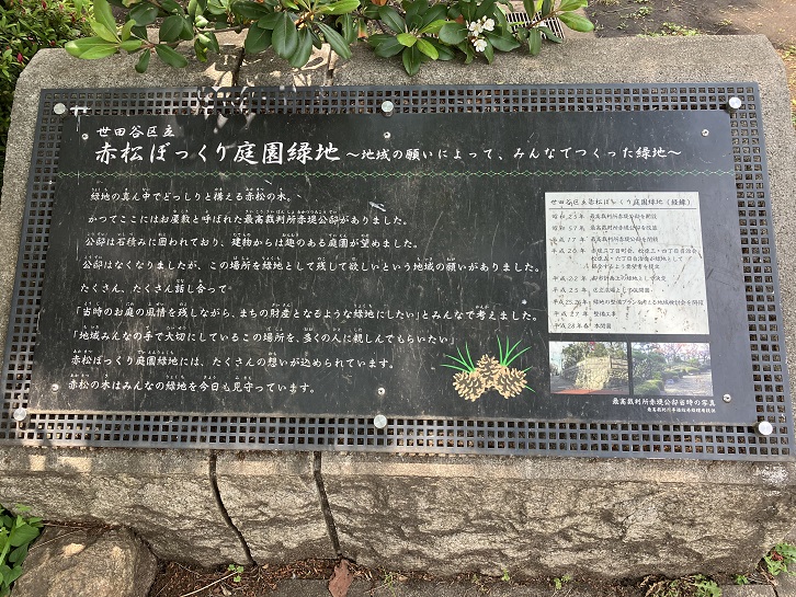 緑地の真ん中でどっしりと構える赤松の木。かつてここにはお屋敷と呼ばれた最高裁判所赤堤公邸がありました。公邸は石積みに囲われており、建物からは趣のある庭園が望めました。公邸はなくなりましたが、この場所を緑地として残して欲しいという地域の願いがありました。たくさん、たくさん話し合って「当時のお庭の風情を残しながら、まちの財産となるような緑地にしたい」とみんなで考えました。「地域みんなの手で大切にしているこの場所を、多くの人に親しんでもらいたい」。赤松ぼっくり庭園緑地には、たくさんの想いが込められています。赤松の木はみんなの緑地を今日も見守っています。