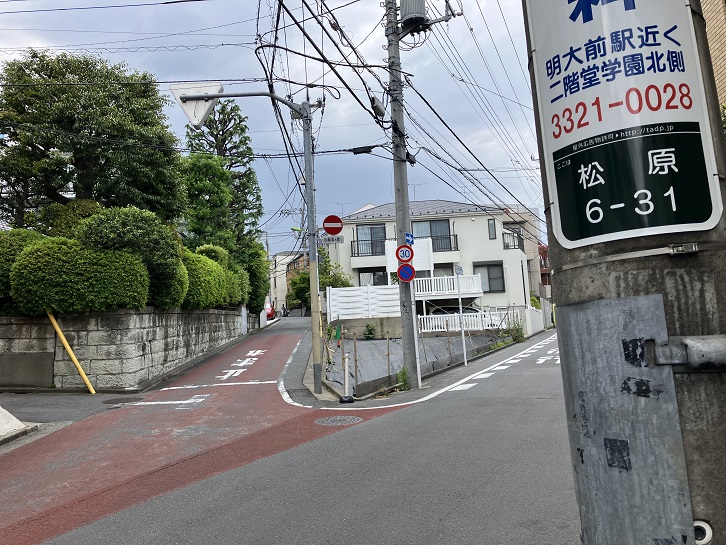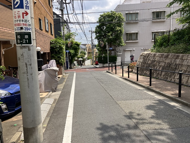東松原坂は長さが約100mほどの緩やかな坂です。坂名は、東松原駅に向かう坂ということで名付けられたと思われます。坂下が階段になっています。