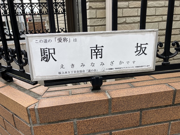 駅南坂は長さが約125mほどの緩やかな坂です。坂名は、桜上水駅南口に向かう道筋の坂で、スーパーや駅を利用する人の往来が絶えないことに因んでいるものと思われます。坂の途中の数ヶ所に、地元自治会が設置した坂の標識があります。