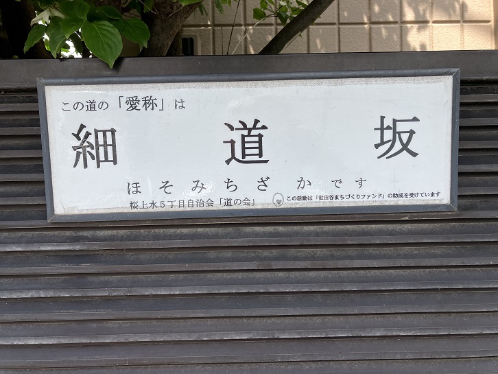 細道坂は長さが約210mほどの緩やかな坂です。途中が底になった浅い擂鉢状の坂になっています。坂名は、愛称がついた坂の中で一番細い道であることに因んでいます。狭い坂道ですが、この道を利用する愛好者が結構多いそうです。坂の途中の数ヶ所に、地元自治会が設置した坂の標識があります。