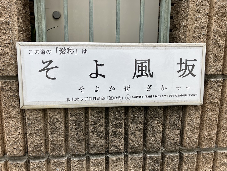 そよ風坂は長さが約270mほどの緩やかな坂です。途中が底になった浅い擂鉢状の坂になっています。坂名は、坂の途中に十字路があり、その付近が一番「そよ風」を感じるということに因んでいます。坂の途中の数ヶ所に、地元自治会が設置した坂の標識があります。