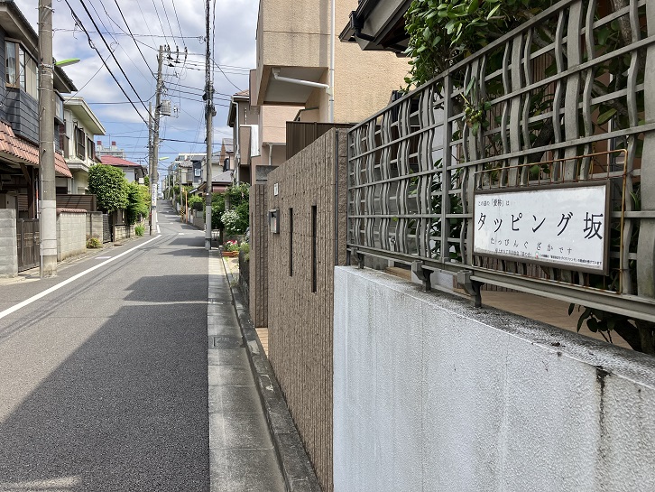 タッピング坂は長さが約280mほどの緩やかな坂です。昭和十五年頃から昭和三十二年頃まで、桜上水五丁目37番地の角地に3階建の立派な洋館があり、地域の目印になっていました。坂名は、そこに住んでいた賀川豊彦さんの通訳や翻訳をしていたヘレン・タッピングさんの名前に由来しています。坂の途中の数ヶ所に、地元自治会が設置した坂の標識があります。