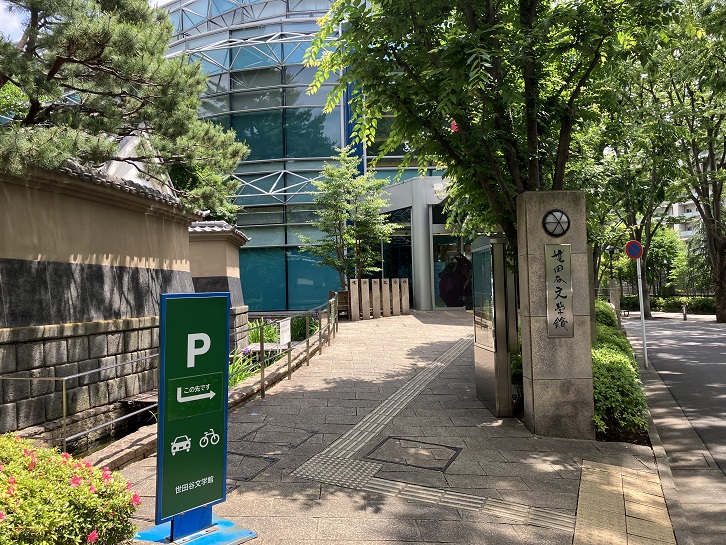 緑道が千歳通りに突き当たる手前に世田谷文学館があります。世田谷文学館は、世田谷に縁のある文学者や芸術家を中心に、新しいものも含めた文学・文化を広く発信する拠点として平成七年(1995年)に開館しました。23区初の地域総合文学館ですが、純文学のようなものばかりではなく、漫画やイラストやからくり絵本など、いわゆる”サブカル”のような、広い意味での文学にまつわる展示も行なっています。