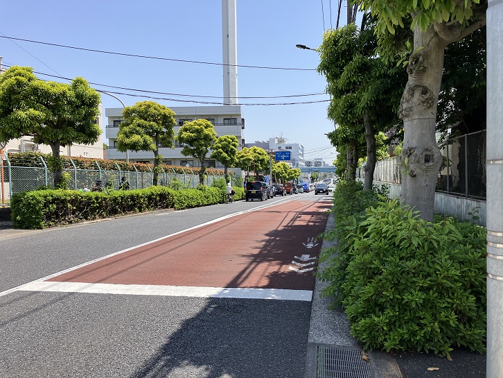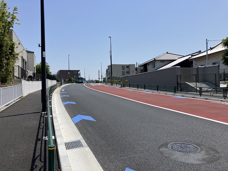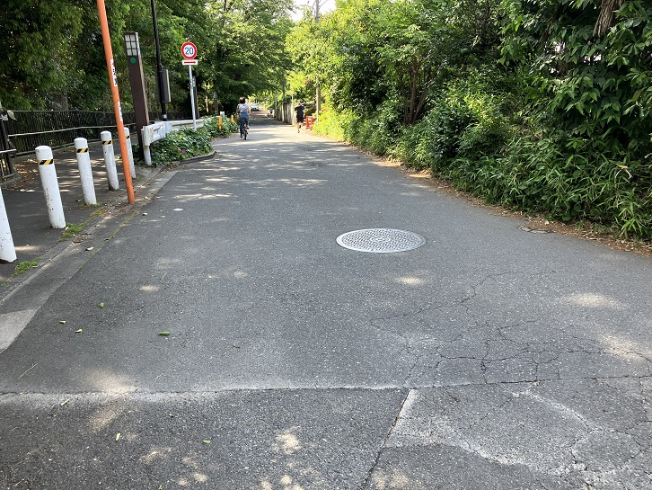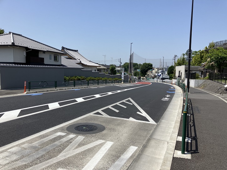 宮下橋の先で都道118号は直線方向が車止めでブロックされ、カーブして北東方向に延びています。道路は一変して道幅が広くなり、真新しい舗装の上に歩道も広くて都心の山手通りのようです。歩道に付きものの電柱は一本もありません。完全無電柱化されているのです。実は、この道路は都道118号線の交通混雑緩和のために、第一弾として都立祖師谷公園の北側から榎交差点の間の約430mに新設された補助54号線というバイパスで、令和5年4月23日に開通したばかりなのです。でも、それは帰ってからネットで知った話。駒大グランド前交差点の次の信号から坂が上がっています。