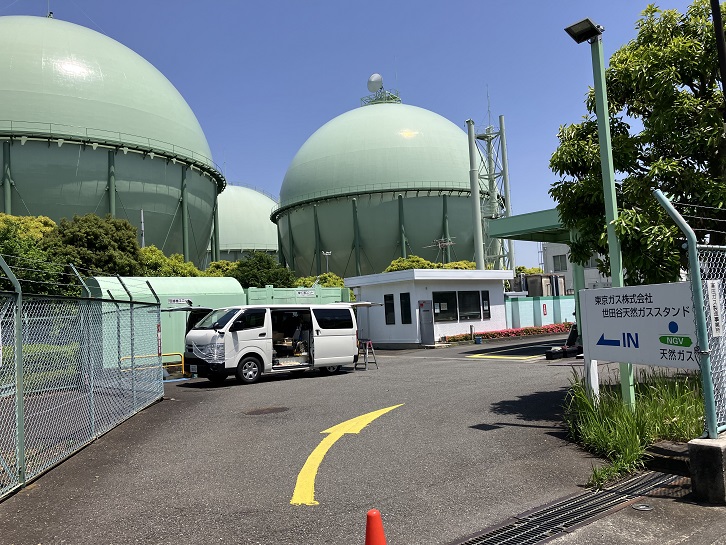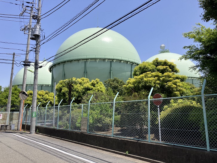 安穏寺坂の坂上にある榎交差点から先の都道118号は比較的道幅も広く、歩道も整備されています。そのまま道なりに進みますと、千歳通りと交差する東京中央農協前交差点の先に巨大なガスタンクが並んでいます。これは東京ガスの世田谷制圧所内にあるガスタンクで、ここには5基の球形をしたガスタンクが設置されています。ガスタンクの正式名称は「ガスホルダー」といい、ひとつの大きさは直径約33m、中の容量は8万世帯の一日分の使用量に相当します。都心のど真ん中にガスタンクを造るとは、今の時代には考えられませんね。