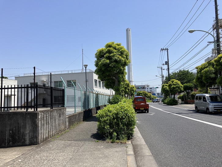 ガスタンクの先には千歳清掃工場の煙突が聳えています。千歳清掃工場は23区内で戦後初めて稼働した清掃工場で、昭和三十年から運転を開始しました。その後、二代目は昭和四十六年に、現在の三代目は平成八年に稼働を開始しました。一日当たり600トンの焼却能力を持ち、余熱は隣接する千歳温水プールに配給しています。