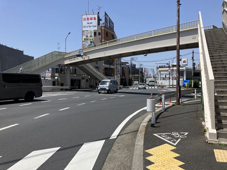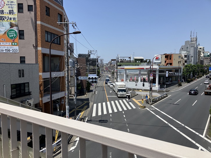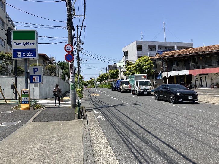 右の写真の交差点に面した三角形の敷地に建つ「こども写真城スタジオアリス環八船橋店」の後方を斜めに通る道路が荒玉水道道路です。