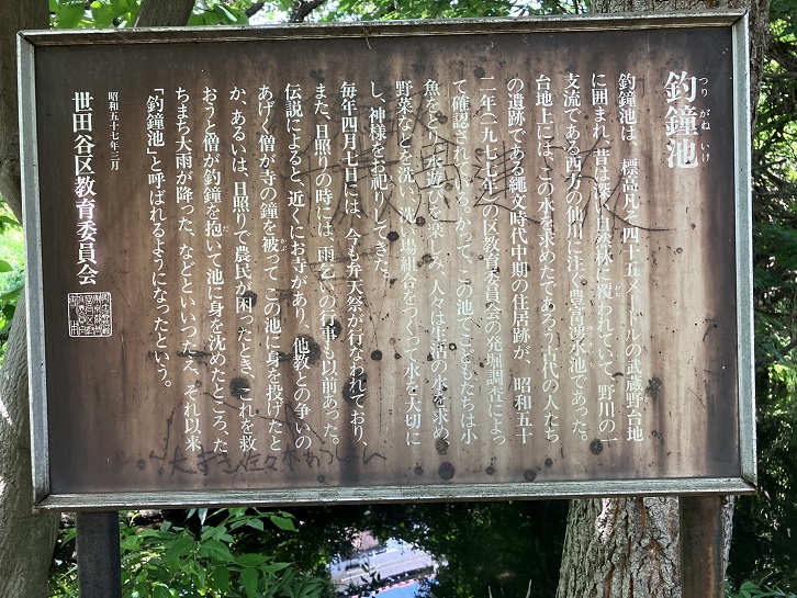 釣鐘池は、標高凡そ四十五メートルの武蔵野台地に囲まれ、昔は深い自然林に覆われていて、野川の一支流である西方の仙川に注ぐ豊富湧水池であった。台地上には、この水を求めたであろう古代の人たちの遺跡である縄文時代中期の住居跡が、昭和五十二年(1977年)の区教育委員会の発堀調査によって確認されている。かって、この池でこどもたちは小魚をとり、水遊びを楽しみ、人々は生活の水を求め、野菜などを洗い、洗い場組合をつくって水を大切にし、神様をお祀りしてきた。毎年四月七日には、今も弁天祭が行なわれており、また、日照りの時には、雨乞いの行事も以前あった。伝説によると、近くにお寺があり、他教との争いのあげく僧が寺の鐘を被ってこの池に身を投げたとか、あるいは、日照りで農民が困ったとき、これを救おうと僧が釣鐘を抱いて池に身を沈めたところ、たちまち大雨が降った、などといいつたえ、それ以来「釣鐘池」と呼ばれるようになったという。