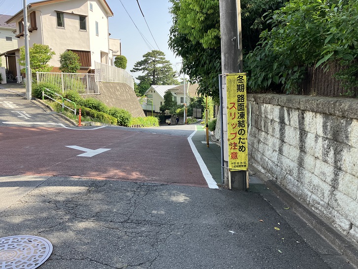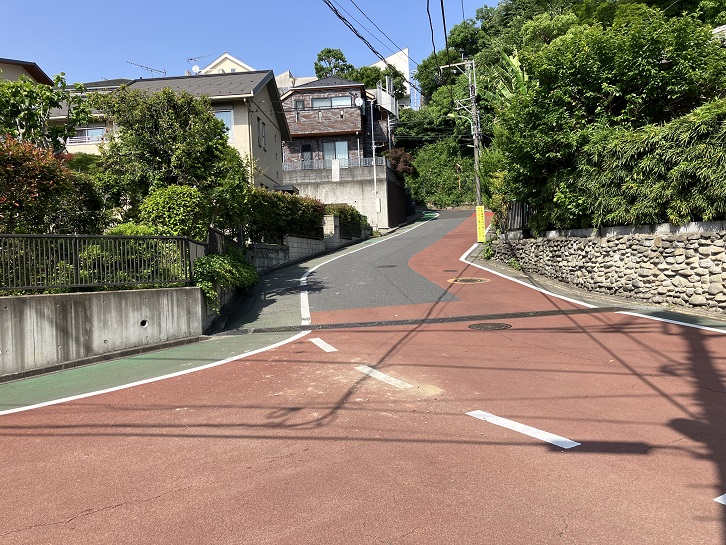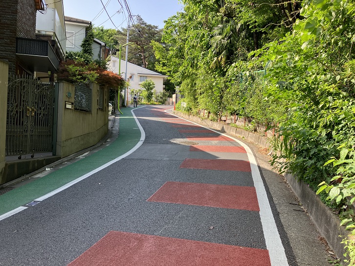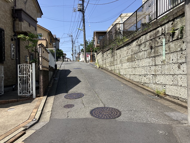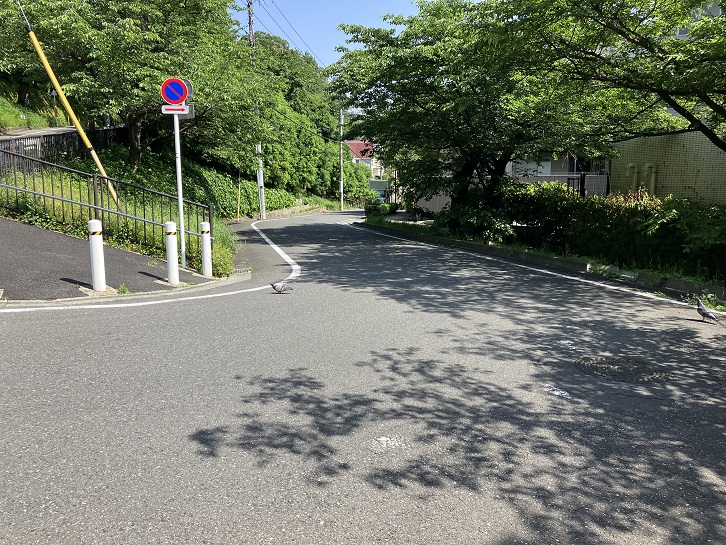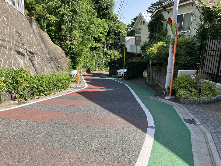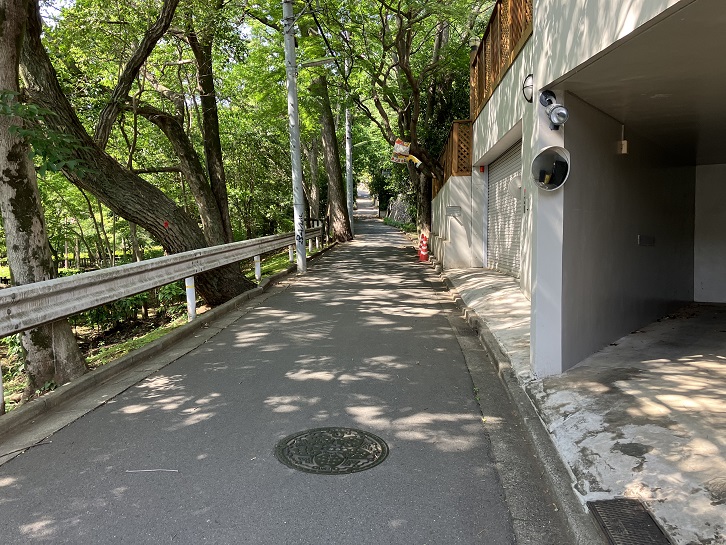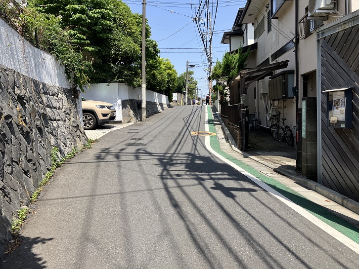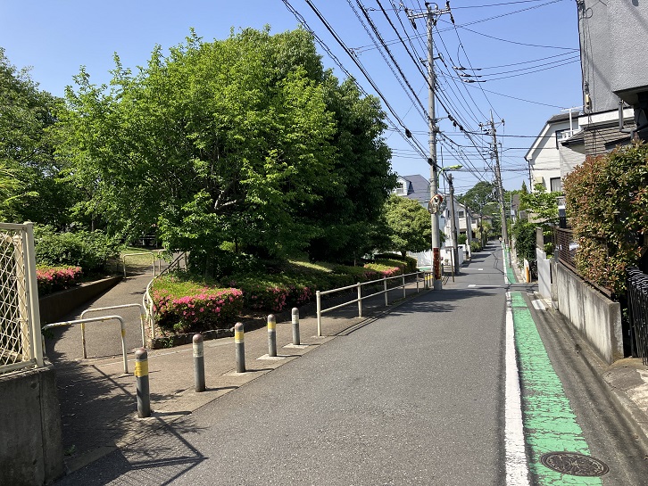 金兵衛坂から次の坂までは結構距離があります。成城通りと成城六間通りを横断し、世田谷郵便局の先で右折します。成城富士見通りのドルフ成城というマンションの手前で右折し、そのまま真っ直ぐに進みますと、三差路が連続するところがあり、突き当たりが左右の道路に分かれています。左手は民家の間を下る狭い急な下り坂、右手は緑地の縁に沿った歩道付きのやや幅広の下り坂になっています。