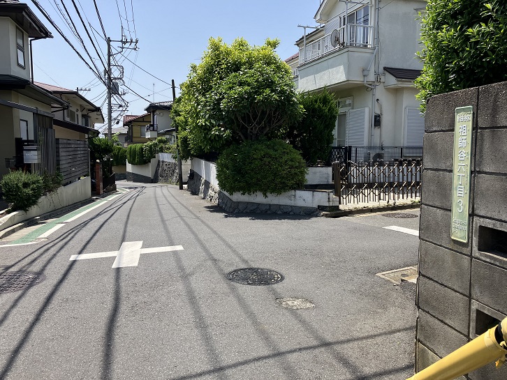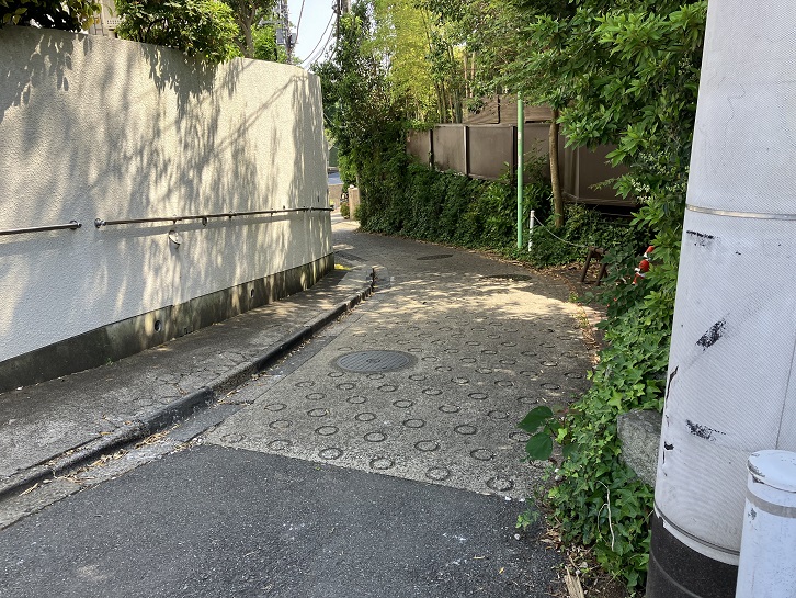 そのまま道なりに進みますと、祖師谷大蔵駅の北口から延びる祖師谷通りに突き当たります。右折してビッグ・エー世田谷祖師谷店の角を左折し、西に進みます。都営祖師谷四丁目アパート1号棟の西端付近が四つ角になっていて、四丁目31番と32番の民家の間をなんということもない短い道路が通っています。