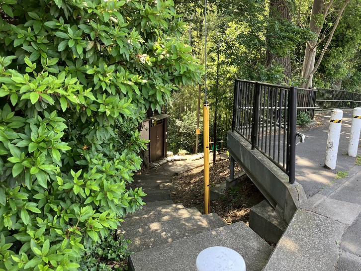 かみの坂はビール坂緑地の雑木林の中を上がる長さが約85mほどのやや急な階段です。坂名の由来ははっきりしていません。段差の間隔が長い独特な階段になって緑地を上がっています。