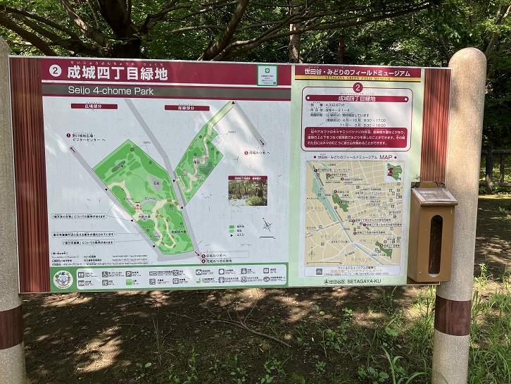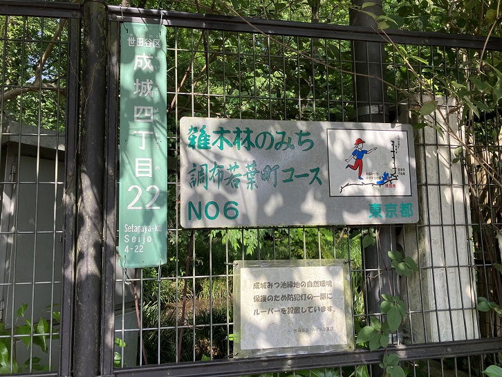 坂下には成城四丁目緑地があります。国分寺崖線の保全を目的とし、斜面地には桜やアカマツの木々やミツバツツジの群落などがあります。約2ヘクタールの広大な斜面林には、2ケ所の湧水と湿生植物群落があり、崖線の上と下をつなぐ散策路で雑木林の緑を楽しむことができます。