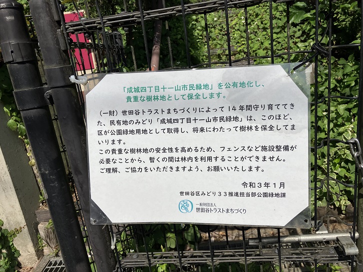 一般財団法人世田谷トラストまちづくりによって14年間守り育ててきた、民有地のみどり「成城四丁目十一山市民緑地」は、このほど、区が公園緑地用地として取得し、将来にわたって樹林を保全してまいります。この貴重な樹林地の安全性を高めるため、フェンスなど施設整備が必要なことから、暫くの間は林内を利用することができません。ご理解、ご協力をいただきますよう、お願いいたします。