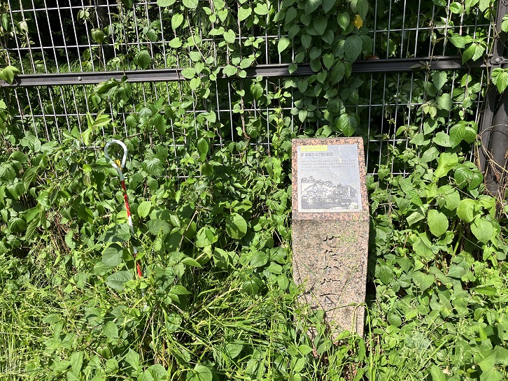 坂の途中に、ひっそりと「ビール坂緑地」の立て札が立っています。その先に車止めがあり、その奥に緑地内を上がる階段が続いています。