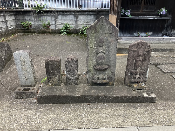 岩船地蔵尊の手前付近から、左にカーブするように坂が上がっています。岩船地蔵尊は安穏寺の境外にある地蔵堂に祭られている地蔵菩薩像です。地藏堂の前には庚申塔や馬頭観世音の石像が並んでいます。この道筋はかっての滝坂街道に当たり、荷役に使われた馬が死んだ時に祀られたのでしょう。