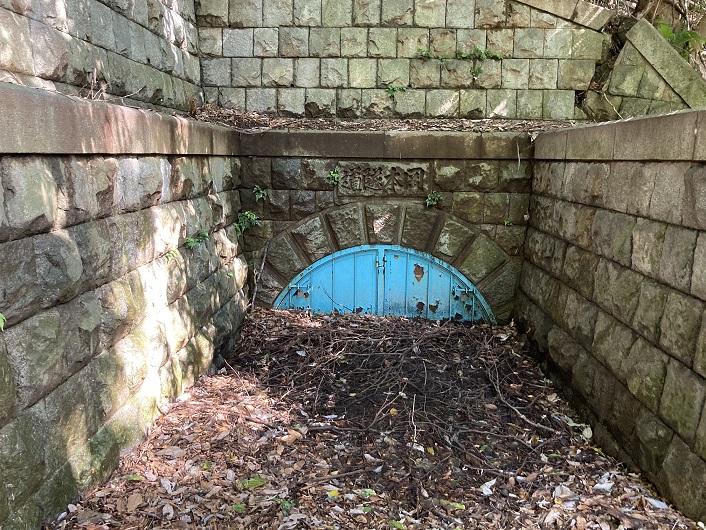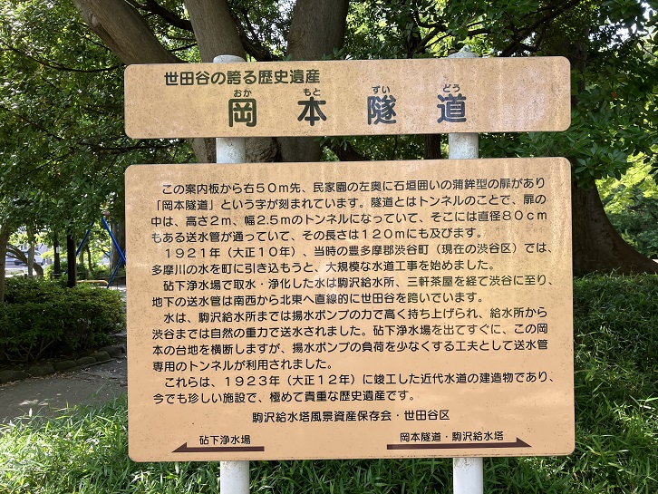 この案内板から右50m先、 民家園の左奥に石垣囲いの蒲鉾型の扉があり、「岡本隧道」という字が刻まれています。隧道とはトンネルのことで、扉の中は、高さ2m、幅2.5mのトンネルになっていて、そこには直径80cmもある送水管が通っていて、その長さは120mにも及びます。大正10年(1921年)、当時の豊多摩郡渋谷町(現在の渋谷区)では、多摩川の水を町に引き込もうと、大規模な水道工事を始めました。粘下浄水場で取水・浄化した水は駒沢給水所・三軒茶屋を経て渋谷に至り、地下の送水管は南西から北東へ直線的に世田谷を跨いでいます。水は、駒沢給水所までは揚水ポンプの力で高く持ち上げられ、給水所から渋谷までは自然の重力で送水されました。砧下浄水場を出てすぐに、この岡本の台地を横断しますが、揚水ポンプの負荷を少なくする工夫として送水管専用のトンネルが利用されました。これらは、大正12年(1923年)に竣工した近代水道の建造物であり、今でも珍しい施設で、極めて貴重な歴史遺産です。