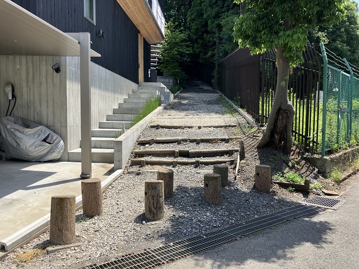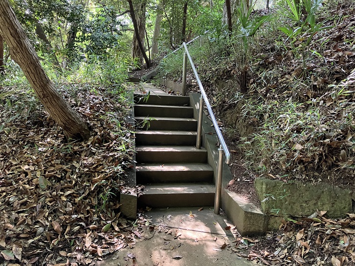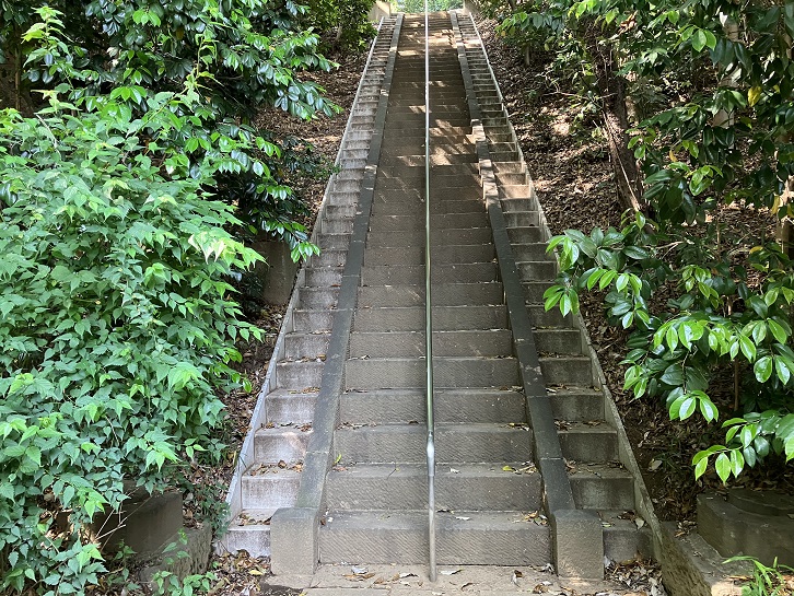 どんぐり坂は長さが約110mほどのかなり急な階段です。別名を「水道坂」といいます。坂名は、雑木林の中にブナ科のカシ・ナラ・カシワなどのコナラ属樹木が混じっていて、その果実であるドングリが拾えるような山道の坂ということに因んでいるのでしょう。ちなみに、ドングリは大量のデンプンを蓄えているために多くの動物の食料になるだけでなく、生食したり炒めたりして人間の食用にもなっています。別名の「水道坂」は、土の下に水道管が埋まっていることに因んでいます。