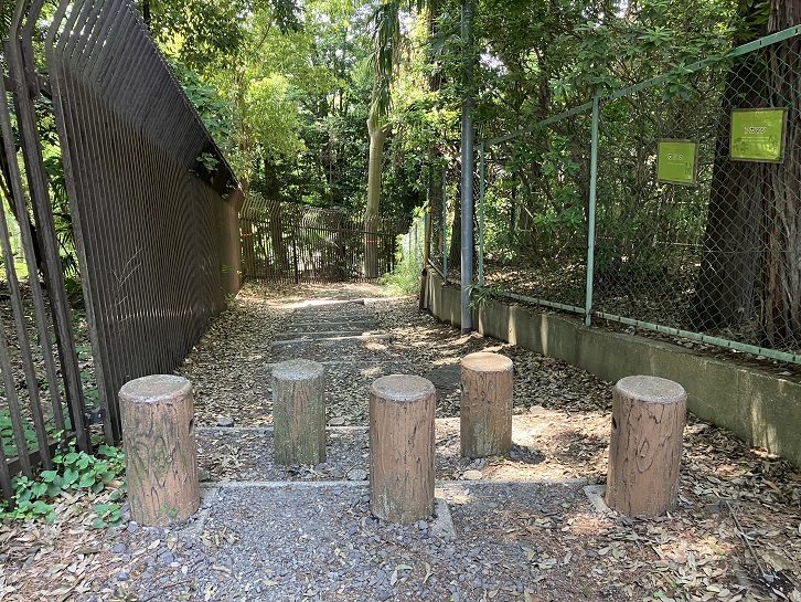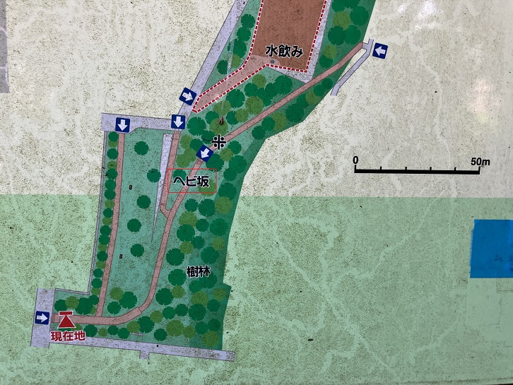 ヘビ坂は長さが約130mほどの国分寺崖線の斜面を斜めに下るやや急な坂です。坂名は不明ですが、緩やかに蛇行している形がヘビに似ているとか、崖線の坂道なので実際にヘビが出るとか、そういったことに因んでいるのでしょう。入口の奥から狭い散策路が下っています。坂の途中にはゲートがあり、夜間は立入りできないようになっています。ゲートがなくても通る気はしませんよね。