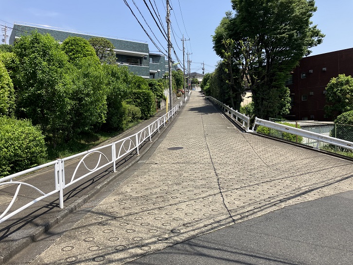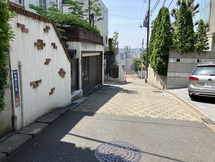 グランド橋を渡り、道なりに進みます。グランエクレール岡本という集合住宅の角から北西に急坂が下っています。