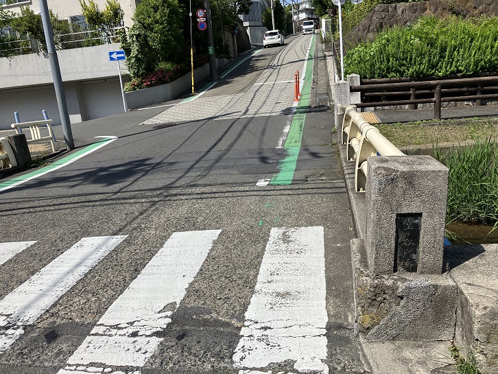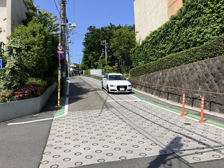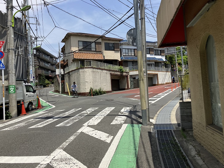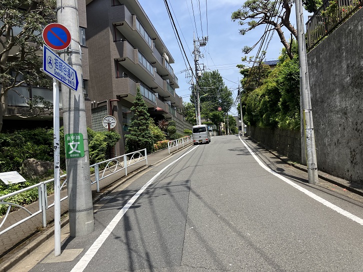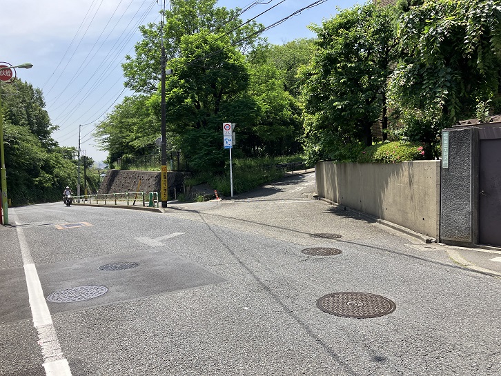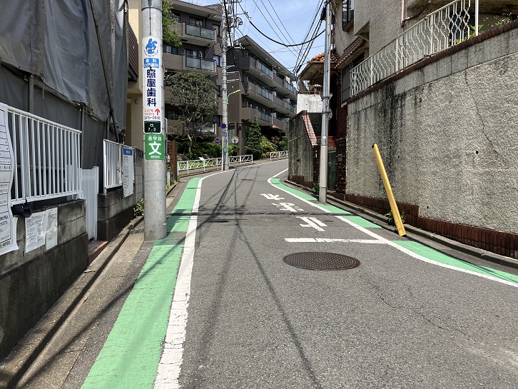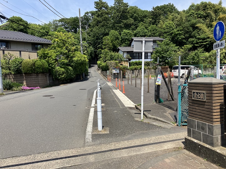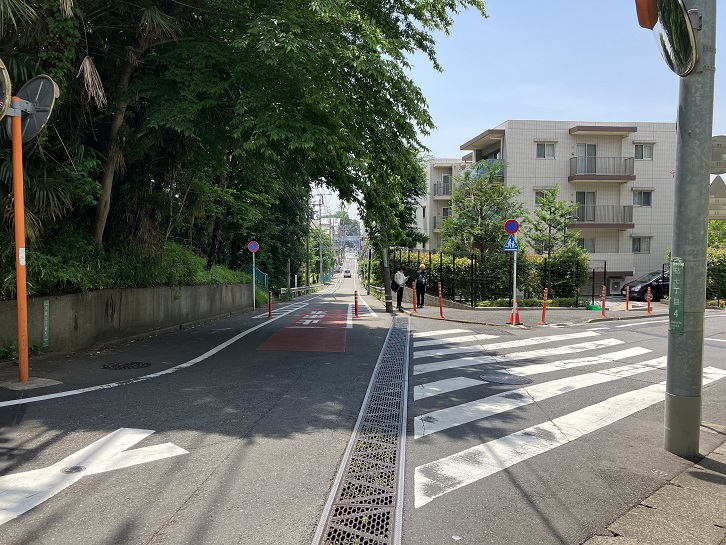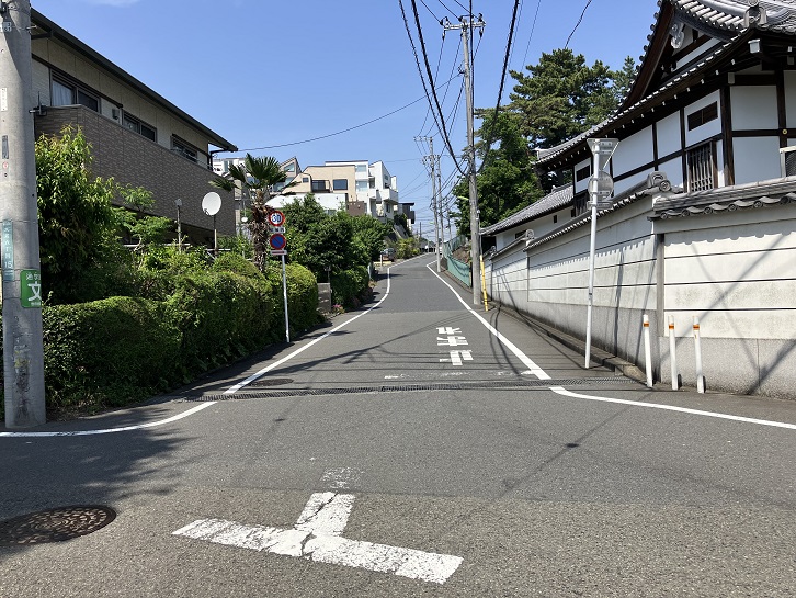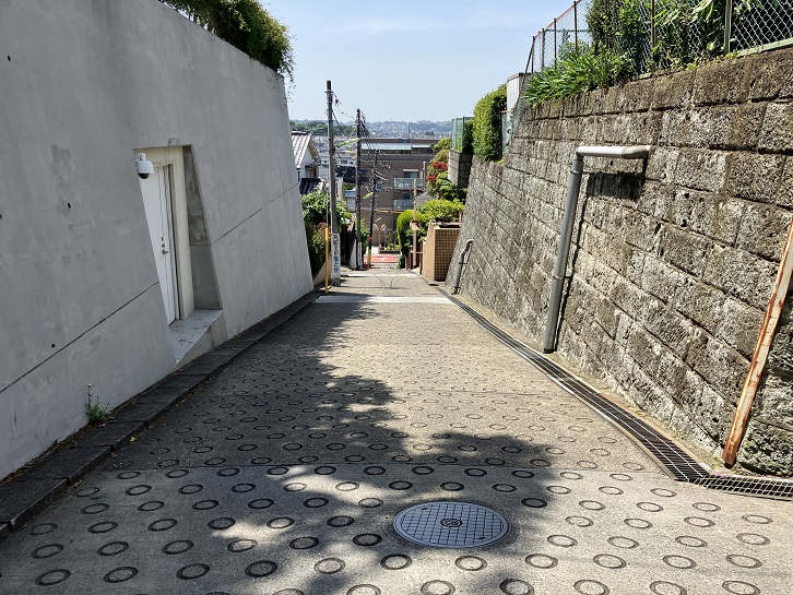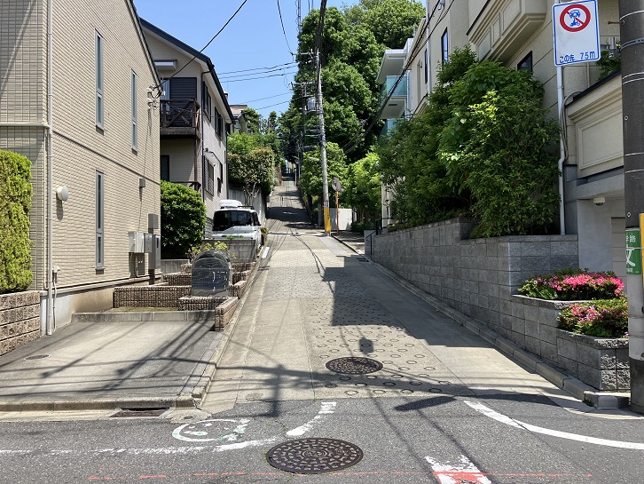 成城歐林邸の先で右折しますと、クランク状の坂が下っています。