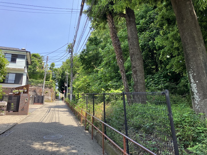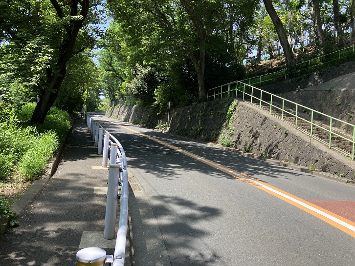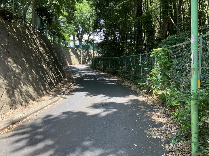 岡本運動公園の南縁に沿って切通しの坂が上がっています。