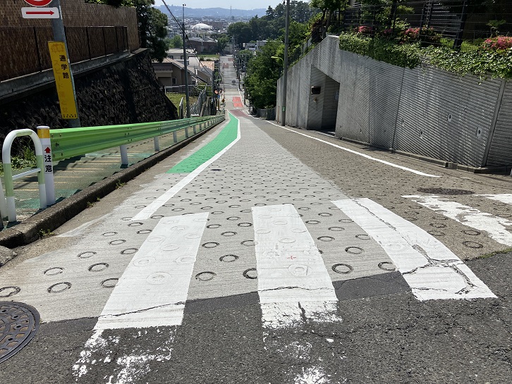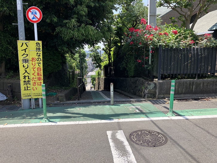 丸坂は長さが約130mほどのかなり急な坂です。別名を「クランク坂」といいます。本当かどうか知りませんが、急坂のためにコンクリート舗装の表面に滑り止めのドーナツ形の丸い凹みが付けられていることに因んで「丸坂」という坂名になりました。別名の「クランク坂」は、坂上付近でクランク状に曲がっていることに因んでいます。どちらもまんまの坂名ですね。