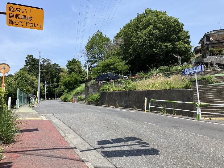 成城通りと世田谷通りが交差する喜多見六丁目交差点から、成城三丁目緑地と砧中学校の間に、武蔵野崖線を切り通しにした坂が上がっています。