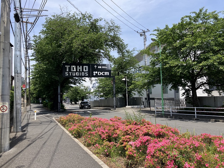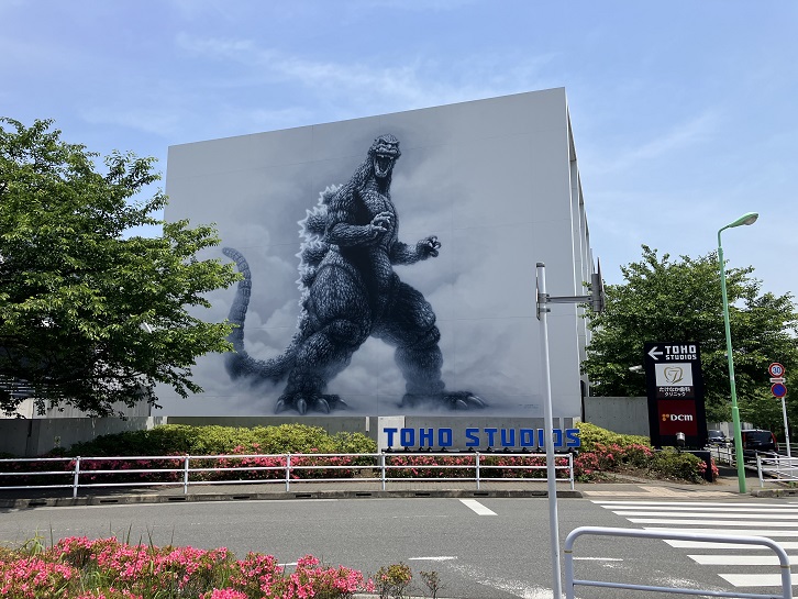 病院坂の坂上から東に進み、成城六間通りに入ります。そのまま坂下に向かいますと、左手に東宝スタジオへの入口があります。入口の脇の建物の壁には巨大なゴジラの絵が描かれています。ナンカ、昔よりも怖い顔になっているような気がします。