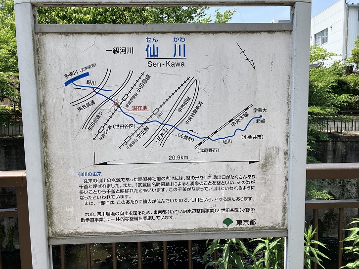 従来の仙川の水源であった勝渕神社前の丸池には、釜の形をした湧出口がたくさんあり、千釜と呼ばれました。また、「武蔵国名勝図絵」によると湧泉のことを釜といい、その数が多いことから千釜と呼ばれたともいいます。この千釜がなまって、仙川といわれるようになったといわれています。また、一部には、このあたりに仙人が住んでいたので、仙川という、とする説もあります。