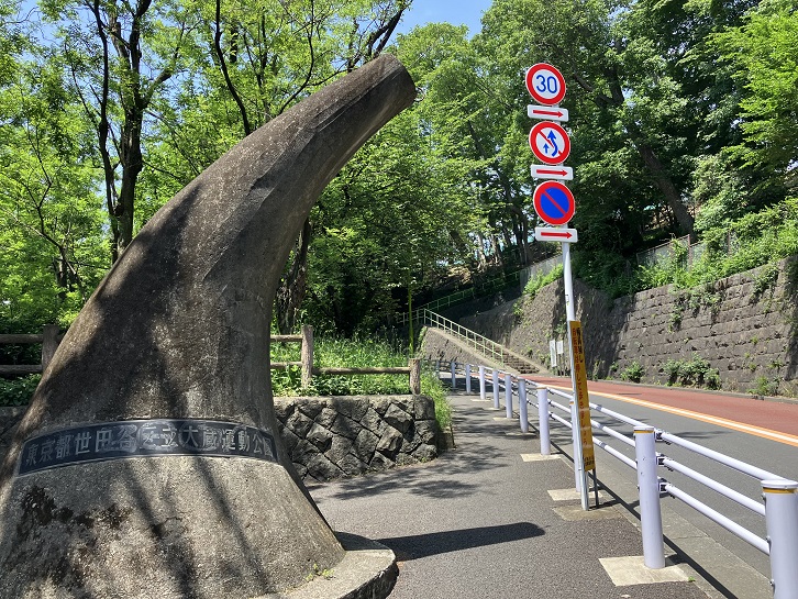 坂下のフェンスの中に世田谷百景の石碑が建っています。