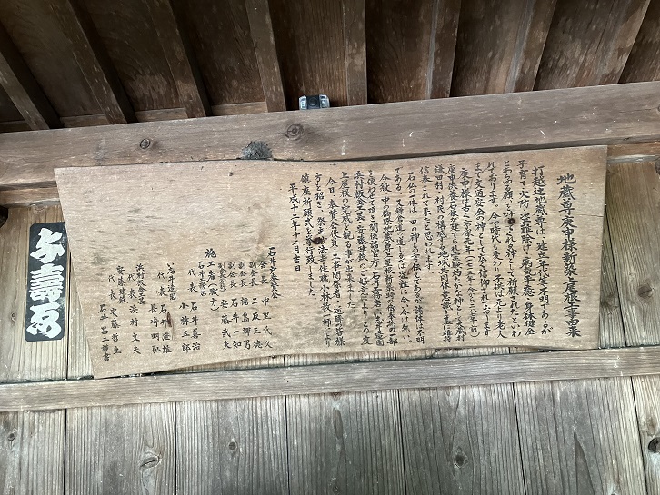 愛宕坂の坂下の打越辻には地蔵尊と庚申塔が祀ってあります。庚申塔は主要な道路の分岐点に置かれることが多く、ひょっとしたら愛宕坂もこの横を下っていたのかもしれません。祠の奥の壁には、「地蔵尊庚申様新築上屋根工事由来」と記した文が掲げられています。祠の前の道は鎌倉道だったんですね。
