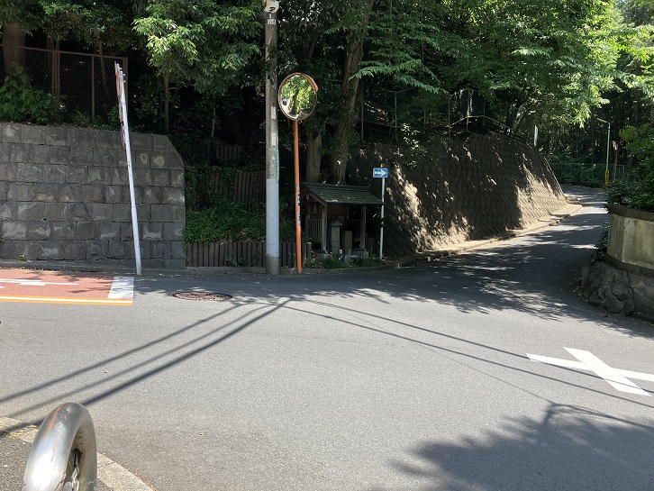 坂は祠の角で右方向に曲がり、そのまま岡本運動公園の南縁の切り通しに沿って左にカーブしながら上がっています。