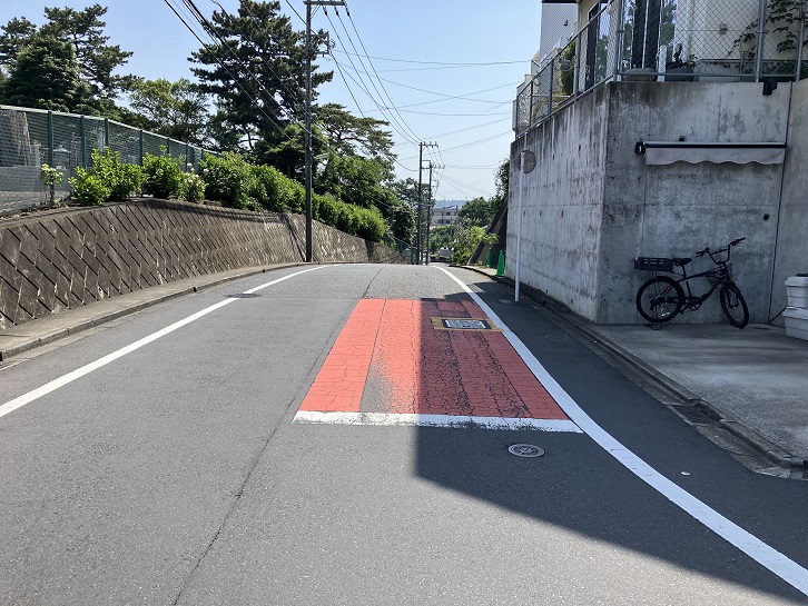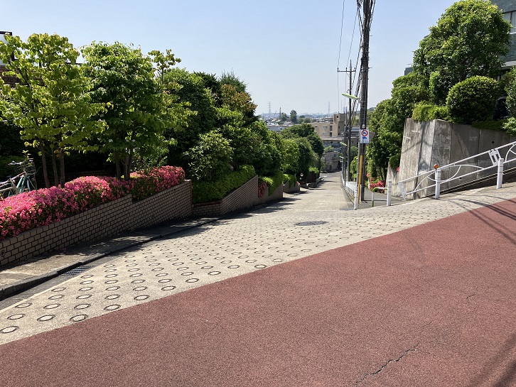 岡本三丁目の坂は長さが約95m(もちょっと長そう)ほどの非常に急な坂です。別名を「富士見坂」といいます。坂名は、岡本三丁目にある坂ということに因みます。車で坂を下ろうとすると、まるで落下するかのような感覚になります。その分坂の上からの眺めは絶景で、晴れた日には富士山が眺望できます。