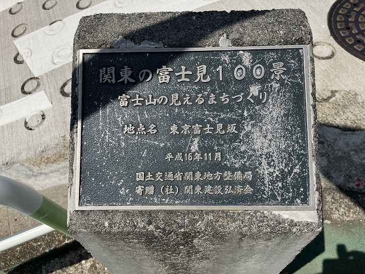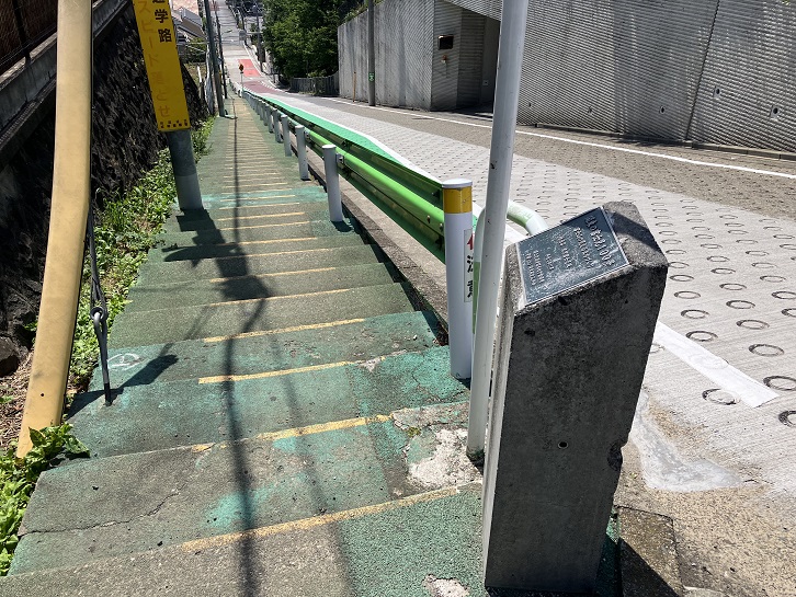 坂上には、「関東の富士見100景 富士山の見えるまちづくり」の石碑が建っています。間違いなく、この坂が岡本三丁目の坂です。あまりの急坂なので、歩行者用に階段も付属しています。雪が積もったら、転んで雪だるまになって転げ落ちますからね。