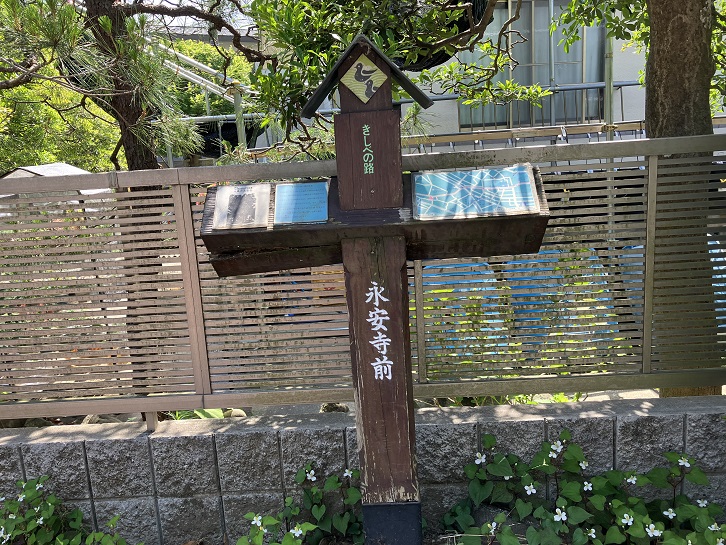 永安寺の向かいに、「きしべの路」の案内柱が立っています。この標識はこの辺りの旧河川跡でよく目にします。