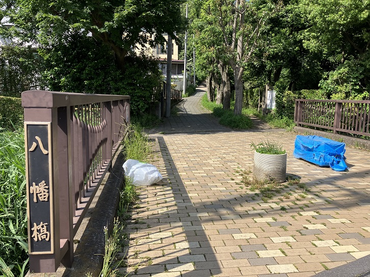 八幡橋の先に、民家園と静嘉堂文庫の間を緩い階段風の坂が上がっています。坂は途中で左に折れて岡本八幡神社に階段で上っています。坂学会ではこの八幡神社に上がる階段部分のみを八幡女坂としていますが、八幡神社正面の男坂と対比するのであれば、八幡橋から先の階段風の坂も含めた方が妥当なように感じます。