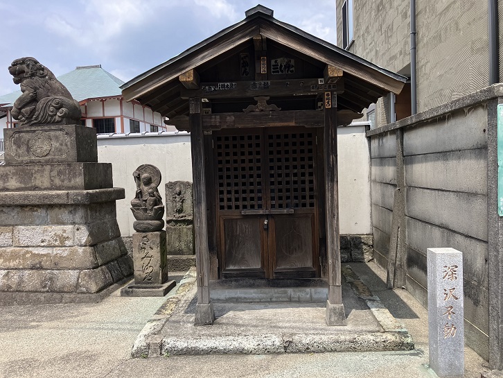 駒沢公園通りと駒沢通りの交差点の北西側の角に深沢不動堂(正確には、深沢不動教会といいます)があります。明治時代に当時の深沢村で成田山信仰の機運が高まり、村内にも成田山の本尊を模した不動明王を祀ったお堂を建てようという動きが出ました。明治三十一年(1898年)に地元の秋山紋兵衛が発起人になり、村内の多くの人が協力して隣接する医王寺の境内仏堂として深沢不動堂が建立されました。戦後、昭和二十七年(1952年)に深沢不動教会として医王寺から独立しましたが、今でも医王寺とは関係が深いそうです。