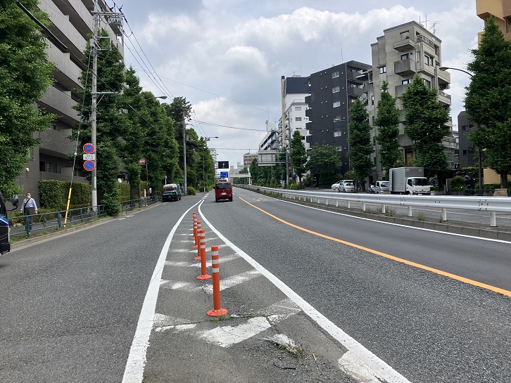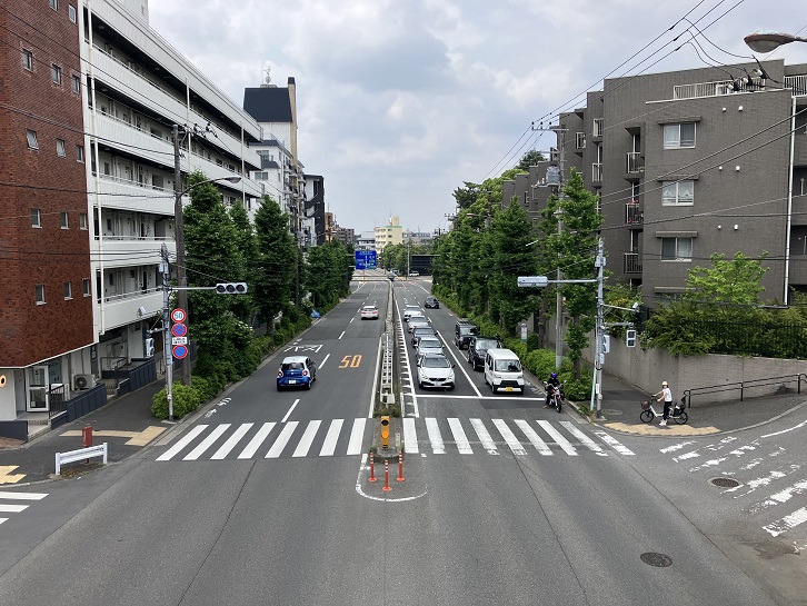 駒沢公園通りを等々力方向に南下し、等々力三丁目交差点で目黒通りに合流します。目黒通りが交差点の先から満願寺の手前まで坂になって下っています。