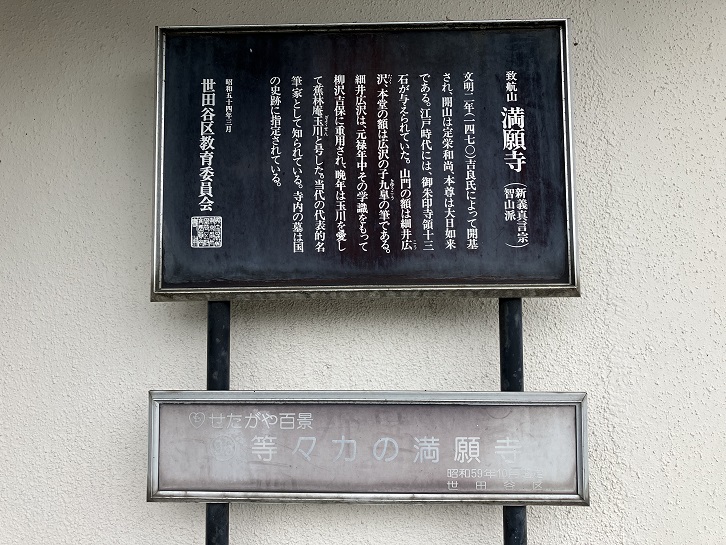 山門の扁額「致航山」は細井廣澤の書で、本堂の扁額「満願寺」は細井廣澤の子である細井九皋の書です。