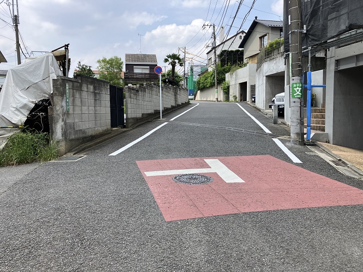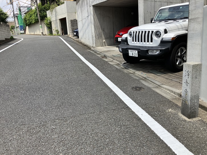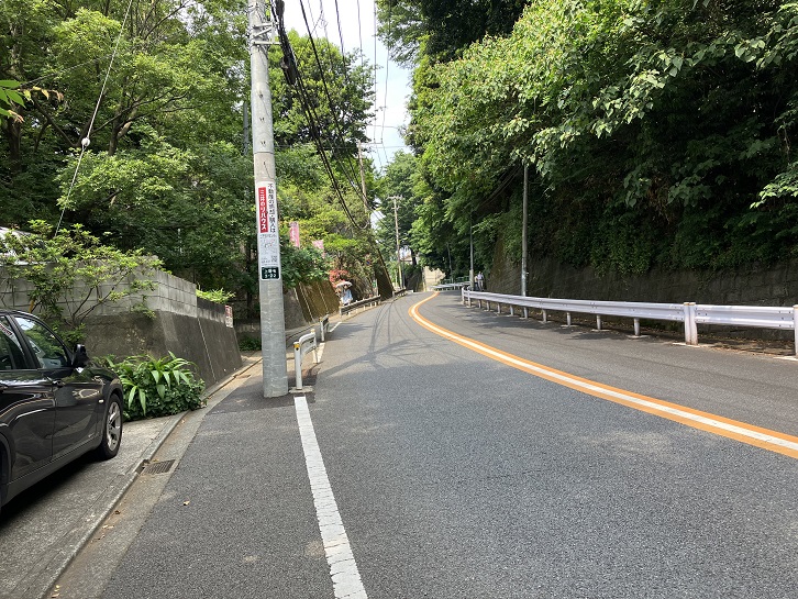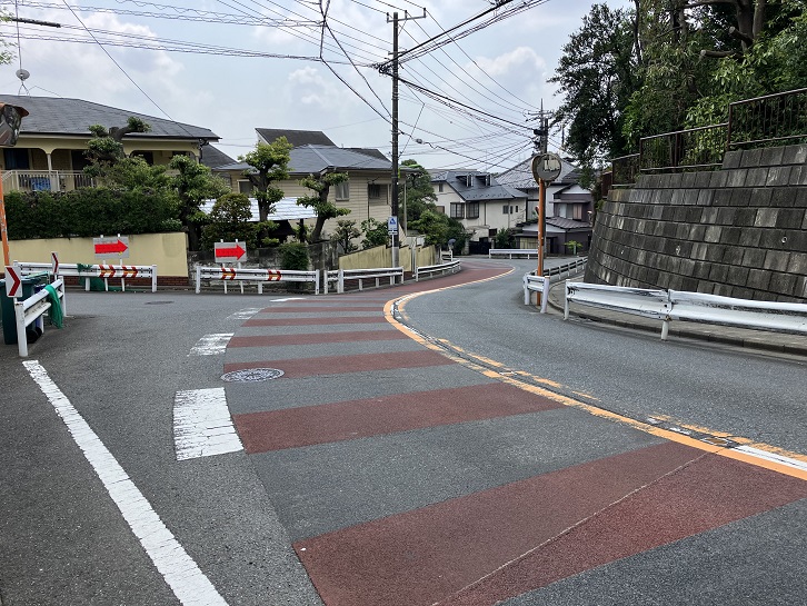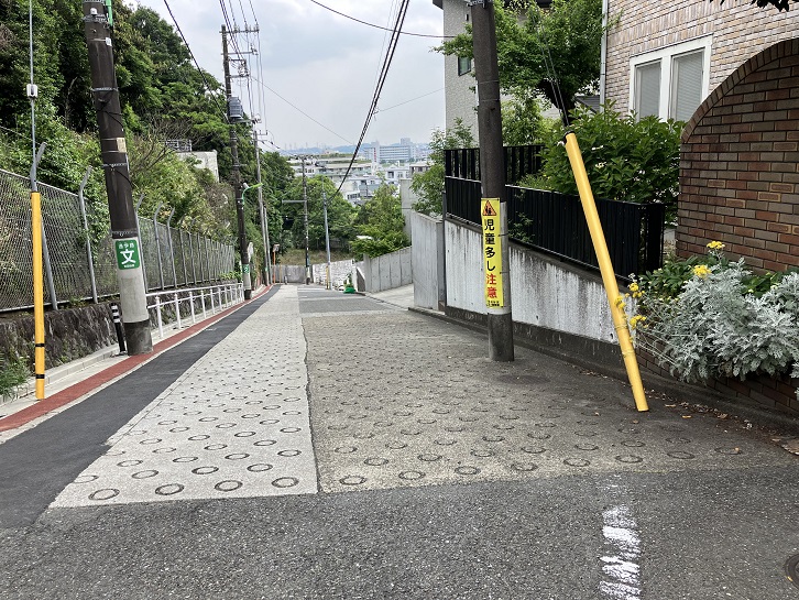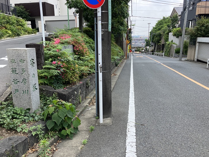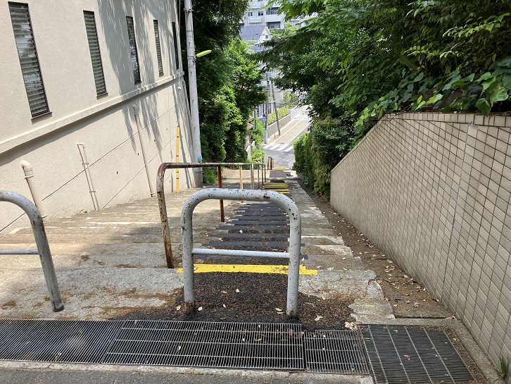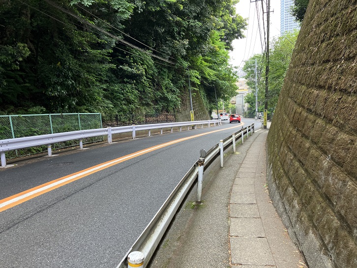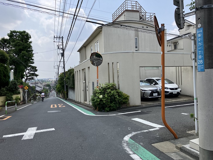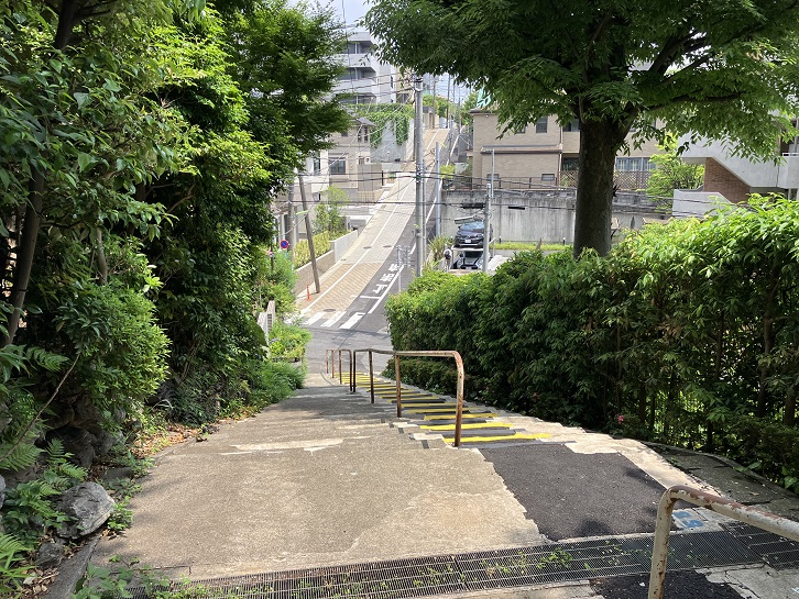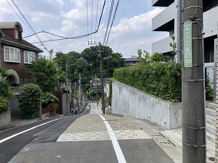 尾山台交差点で環八通りを横断して住宅地の路地を進みます。3ブロック先で右折しますと、その先に急な坂が下っています。23区の坂の中でも有数の急勾配の坂です。