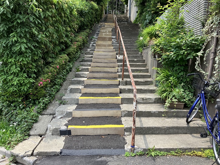向田坂の坂下の道路を挟んで、階段が向かい合っています。