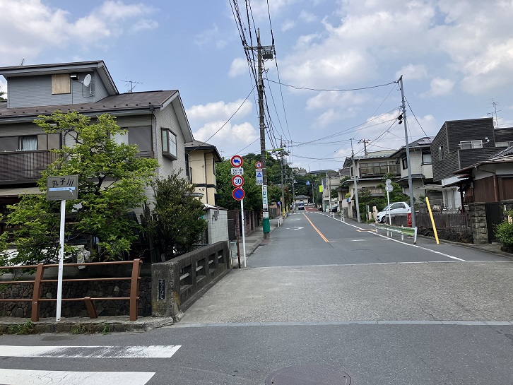 丸子川を上流方向に向かいますと、上野毛自然公園の西側に沿って通る上野毛通りに稲荷橋から坂が上がっています。