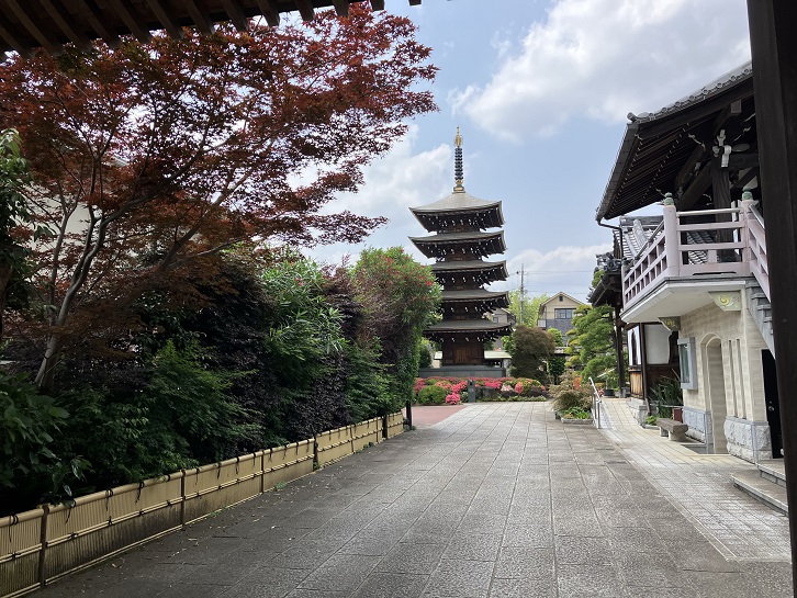 寮の坂は別名を「堂の坂」といいます。坂名の由来は、江戸時代に坂の東側に傳乗寺の本堂や学寮があったことに因んでいます。傳乗寺の創建年代は不明ですが、16世紀末頃といわれています。山門の奥に聳える木造の五重塔は平成十七年(2005年)に新しく建立されました。