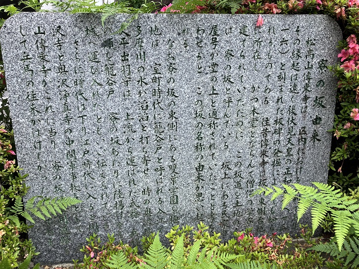 坂上の二叉路の角に、道標を兼ねた坂名の石柱が建っています。その隣の植え込みの中には、坂名の由来を記した案内板が置かれています。