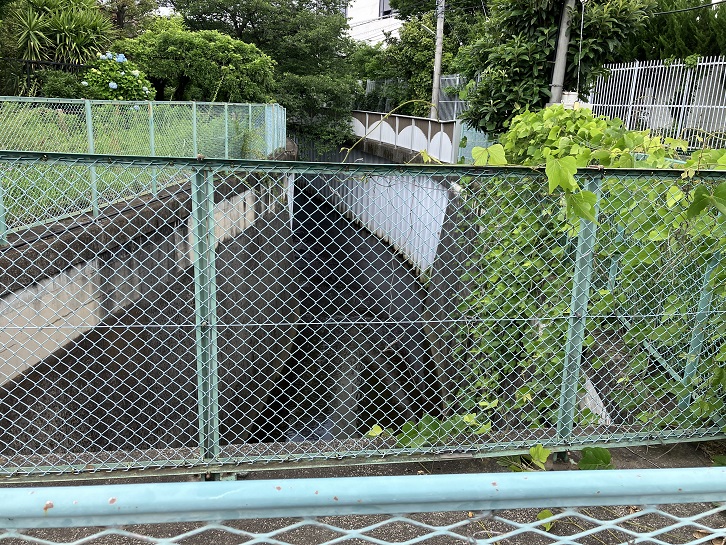 向田坂の坂上に戻って、住宅地の中を東に進みます。この辺りにはいたるところに坂があります。「尾」は屋根に通じ、「山」と「台」は高台を意味しています。坂だらけなのはもっともです。環八通りの尾山台一丁目交差点から南に1ブロック進んだところから、丸子川に向かって長い坂が下っています。