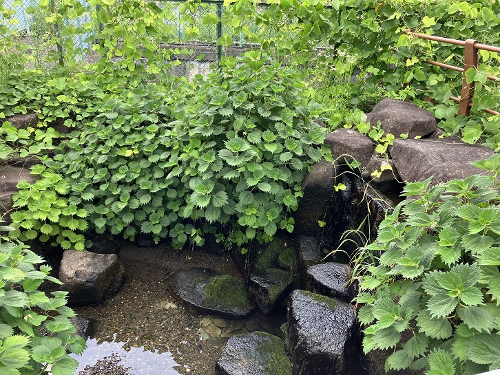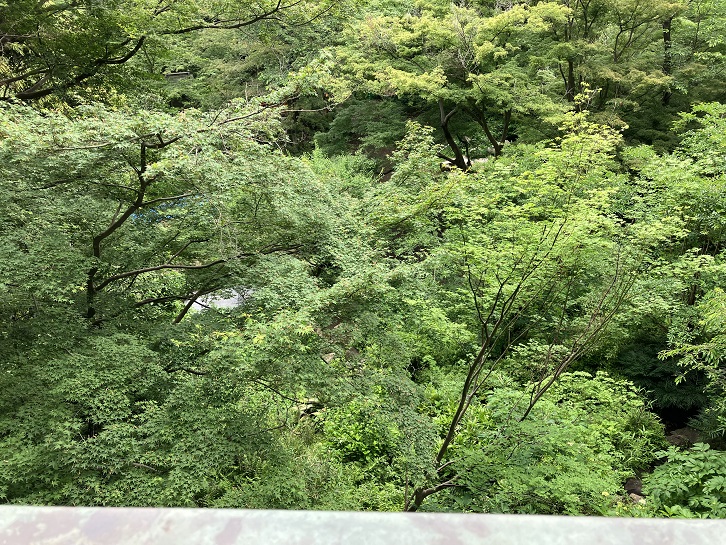 境内には等々力渓谷を高台から一望できる展望台があり、緑に包まれた渓谷が目にも鮮やかです。渓谷の底には遊歩道が整備されていますが、下から見上げても展望台は見えません。それほど木々が密集しているのです。