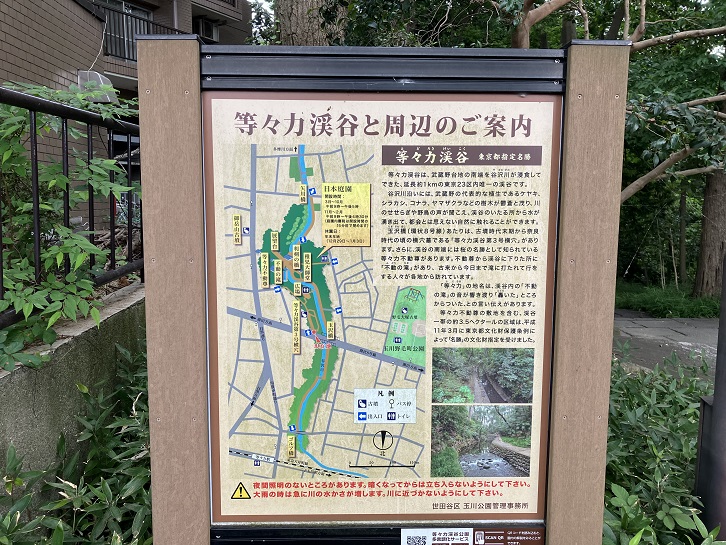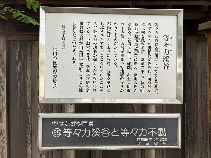等々力不動尊に隣接して等々力渓谷があります。東京23区内では貴重な自然湧水による滝や豊かな動植物が見られるスポットになっていて、せたがや百景の「95 等々力渓谷と等々力不動」に選ばれています。山門前に案内板が立っています。